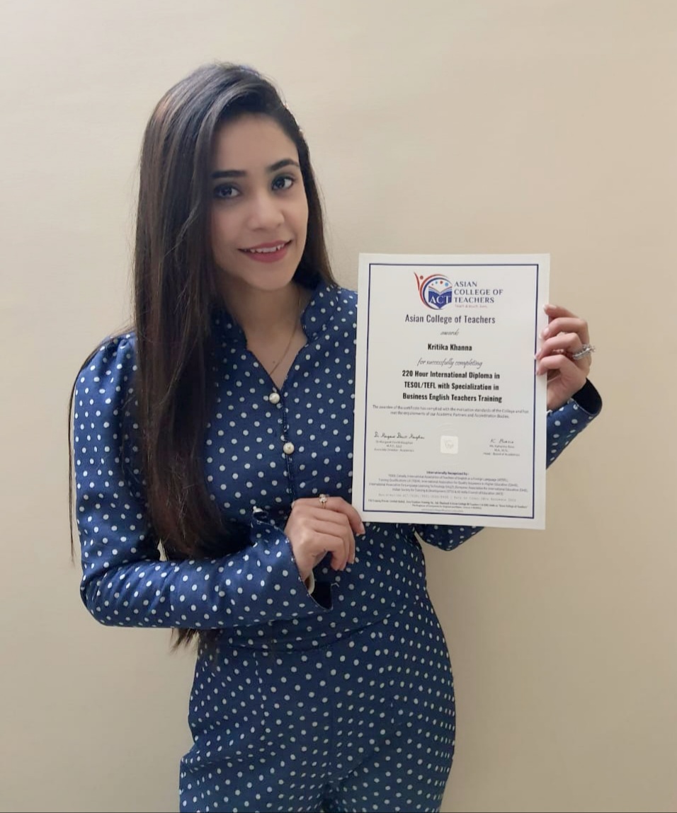 It was a pleasure and wise choice to pursue my TEFL course with Asian College of teachers (ACT). I got a chance to learn various effective techniques and methodologies of teaching English as a foreign language. I must say this is one of the highly recommended courses to enhance your teaching skills. You get to learn about classroom management techniques, language teaching methods, lesson planning, integration of language skills, use of teaching aids in classroom etc. The course content is great and the assignments are well designed. Working on assignments involve the use and enhancement of learner’s cognitive ability, problem solving skills, teaching skills, classroom management skills and proper understanding of the course content. Moreover, you learn a lot about how to make learning interesting and engaging for students through role plays, simulations, dialogues etc. I would also like to extend my gratitude towards my mentor for guiding me throughout and providing me with constructive and valuable feedback on my work. Really, it’s been a great and insightful journey of learning with Asian college of teachers. Everything is well planned and well organized about the course and the management is excellent. I would love to opt for other teaching related courses as well from ACT in future. Thank you! ACT.